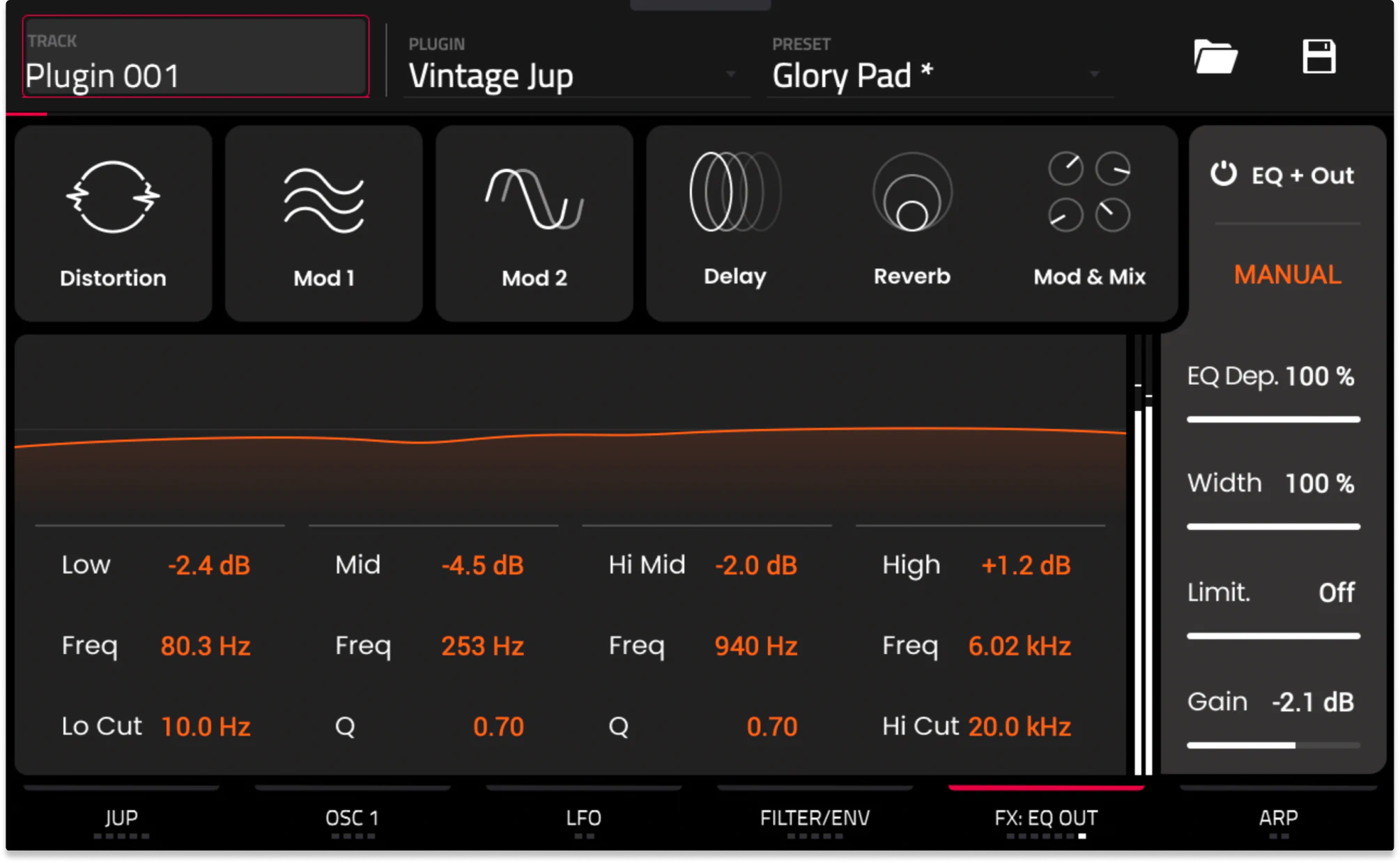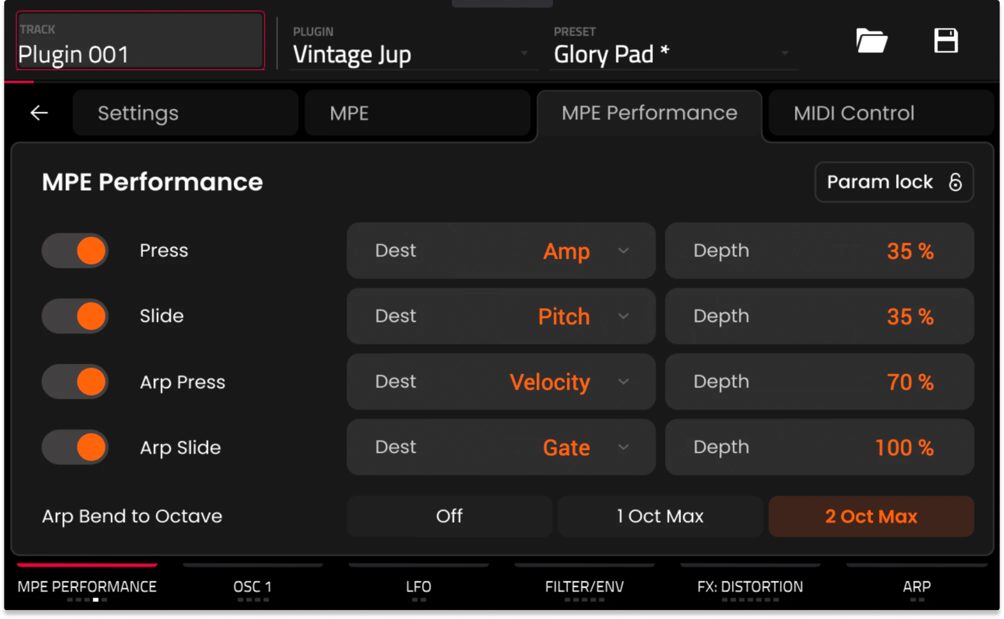 Fabric Vintage Jup is MPE compatible. It also is equipped with assignable mod wheel, aftertouch, expression, and footswitch controls that allow for seamless compatibility with MIDI controllers and other external gear.