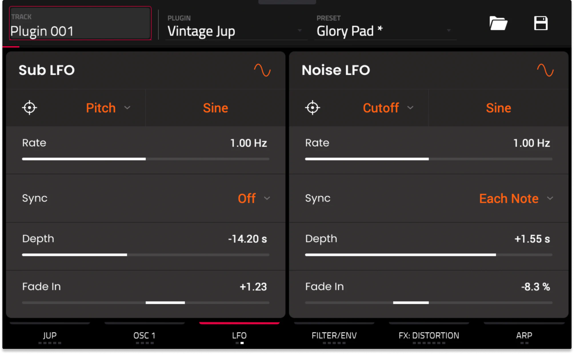 A global LFO with eight different LFO shapes and BPM sync allows you to modulate multiple parameters simultaneously. Adjustable rate, fade-in, and depth controls give you more control over modulation intensity and timing.